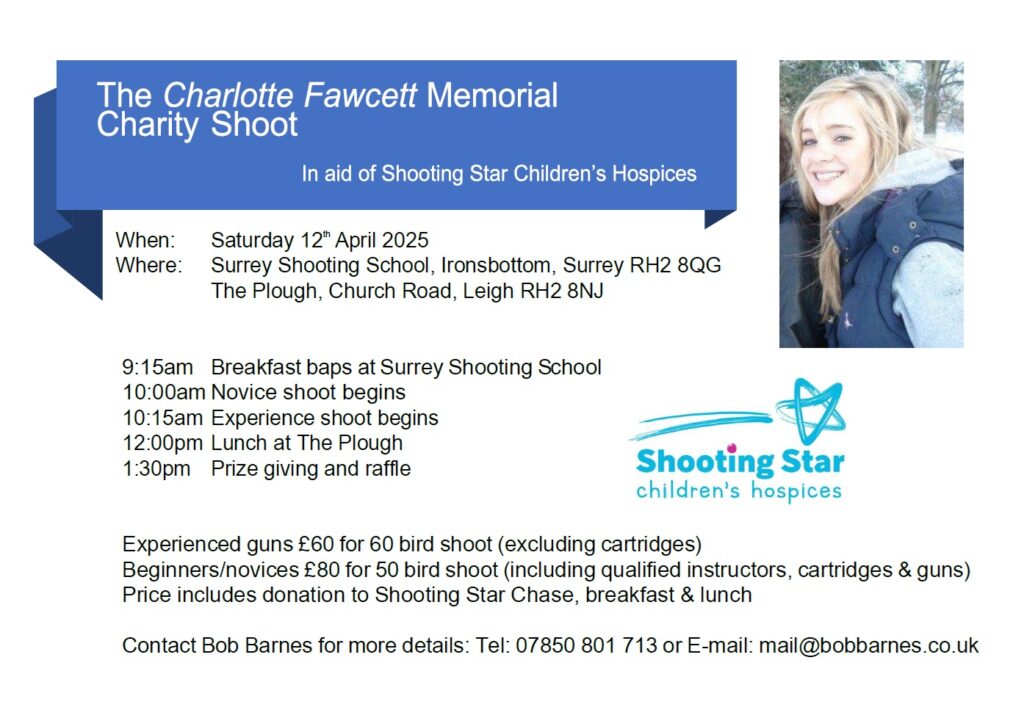 It’s scheduled for SATURDAY 12th APRIL and will be at the usual location which is the Surrey Shooting School and lunch will be at the Plough afterwards.